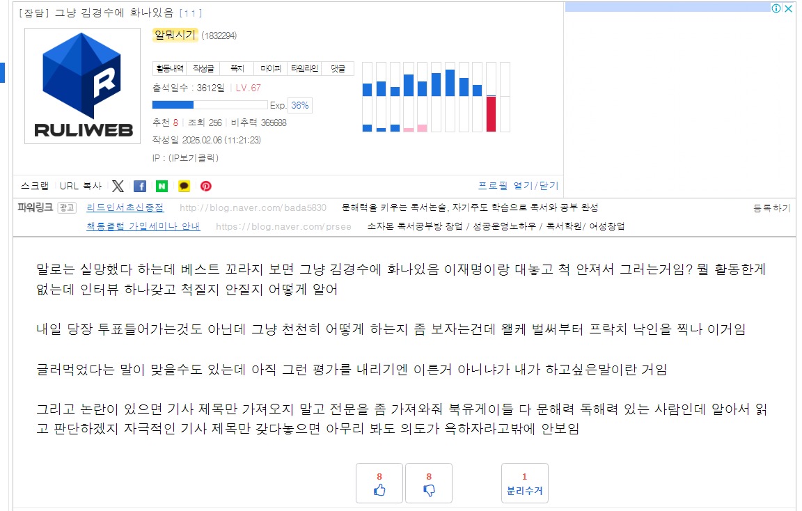 최근글도 아니고 2월글을 갖고 선동질 하면서 논점 이탈하는거 봐라 니가 날 깐 이유가 그거 아님? | 25.10.16 11:48 | | |