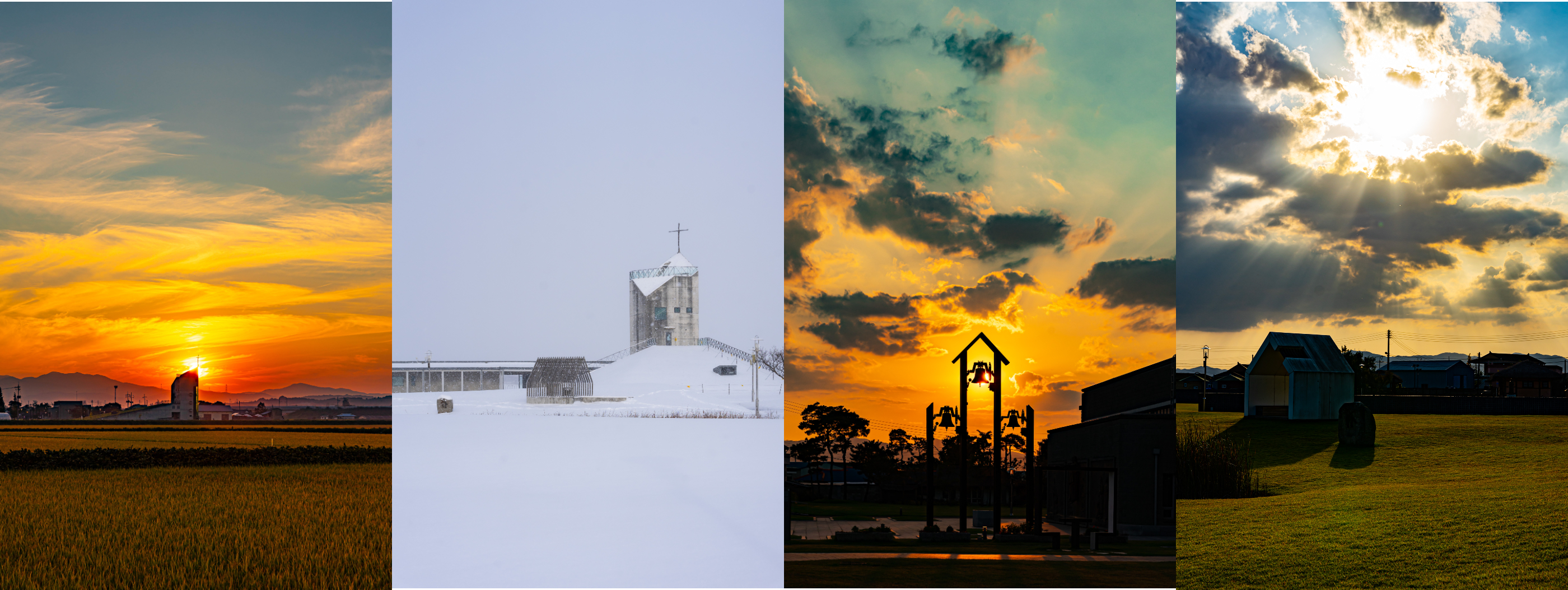 103위 시성을 전후로 80~90년대에 만들어진 성지에는 크고 기념비적인 성당이 왕왕 세워졌지만 요즘은 낮고 자연 속에 녹아들어가는 그런 성지가 많습니다. 무명 순교자들의 줄무덤 터에 세워진 천안의 성거산 성지는 산 위에서 무덤들과 함께 세상을 내려보고(상단 왼쪽), 백여 명의 순교자들이 처형되었던 보령 갈매못 성지는 피가 흘러내려간 바다를 바라봅니다(상단 오른쪽). 당진의 신리 성지는 내포 평야를 그대로 담았고(하단 오른쪽), 포천의 화현 이벽 성지는 유학자가 추구한 천주교의 진리를 표현했죠(하단 왼쪽).