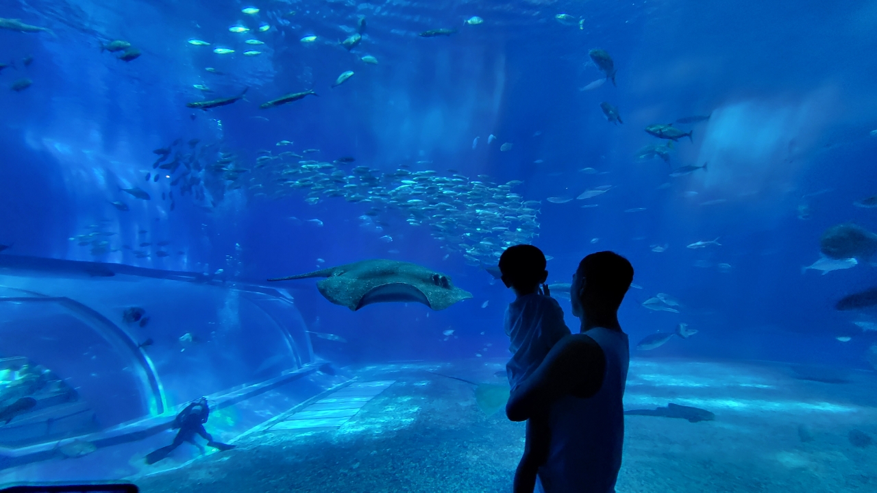 열대어, 가오리, 바다거북까지 있는 큰 수족관이 있는 리조트
