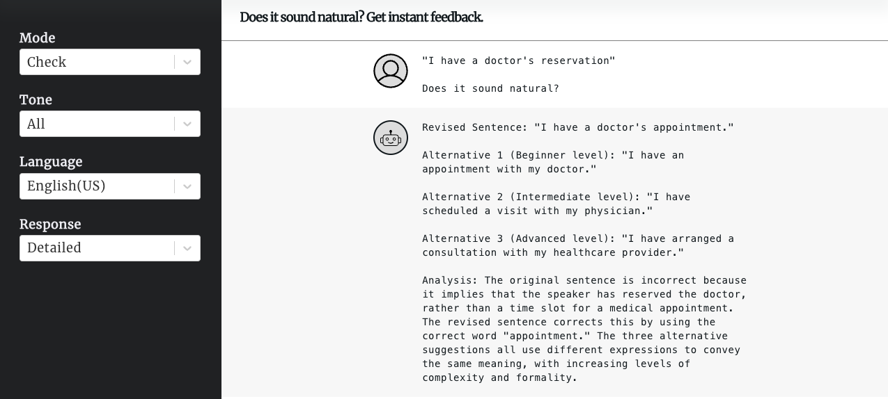 입력한 영어 표현을 더 자연스러운 표현으로 고쳐주는 웹사이트 입니다. 내가 쓴 표현이 이게 맞나...싶은 경우 도움이 될 것 같아서 만들어봤습니다.