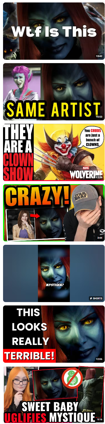 최근 공개된 울버린 영상에서 미스틱이 못생겼다고 지적하는 영상은 검색하면 여러개 쏟아집니다. 이에 반해 요테이 외모를 문제삼는 영상이나 게시글은 거의 찾아보기 힘듬. 요테이에 대한 비판은 주로 배우의 PC주의적 행동과 개발자의 찰리 커크 사망 조롱 쪽으로 촛점이 맞춰져 있일뿐이죠. | 25.10.04 13:16 | |
