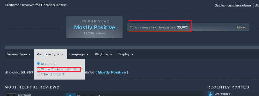 전체 평가 중에 "스팀" "구매"자의 것만 반영함 전체 평가가 53,577인데 그중 36,085만 "스팀" "구매"자의 평가만 레이팅에 반영함 ( 따라서 환불한 사람의 평가는 레이팅에 포함 안됨 따라서 스팀 말고 서드파티 플랫폼을 통해서 키를 구입한 경우 레이팅에 포함 안됨 ) | 26.03.23 15:03 | |