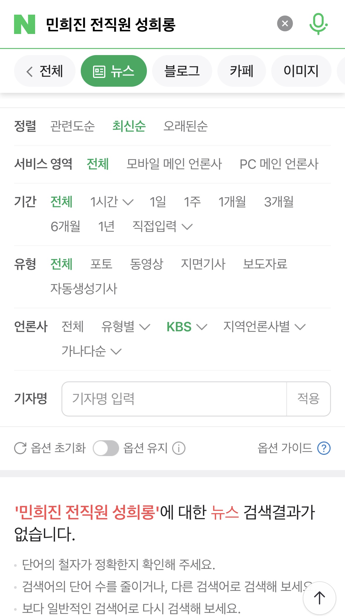 참 투명한 방송사죠. 이거 관련기사 kbs에는 단 하나도 안 뜸. 검색을 못했나해서 민희진으로만 검색해도 반년치 kbs뉴스 다 찾아봤는데도 전직원 성희롱 개입 관련 뉴스를 못 찾았네요.