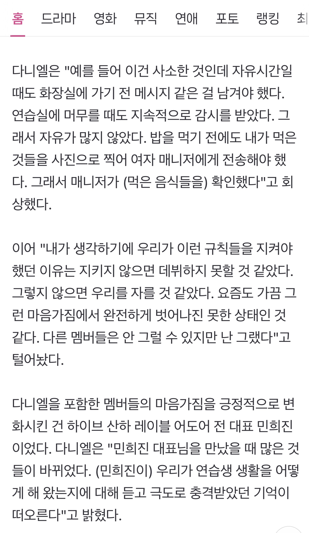 하니 무시발언이 거짓으로 드러나니 그거 그만두고 이제 이걸로 걸고 넘어지는건가? 근데 본문 아무리 읽어도 뭘 말하고 싶은건지 모르겠음. 쏘스가 학대했다는건가? 바퀴벌레 숙소 언급하더니 블핑도 데뷔때 벌레 나오는 숙소 있었단 소리에 짜치고 저 내용들은 걸그룹 카우는 어느 기획사에서든 관리하는 부분일텐데 그걸 학대정황인양 문제를 부풀리네. 얘네들은 대체 왜 하이브서 데뷔한걸까.. 단순 데뷔가 목적이라면 하이브 연습생 타이틀만으로 웬만한 중소에서 데뷔 가능했을텐데..