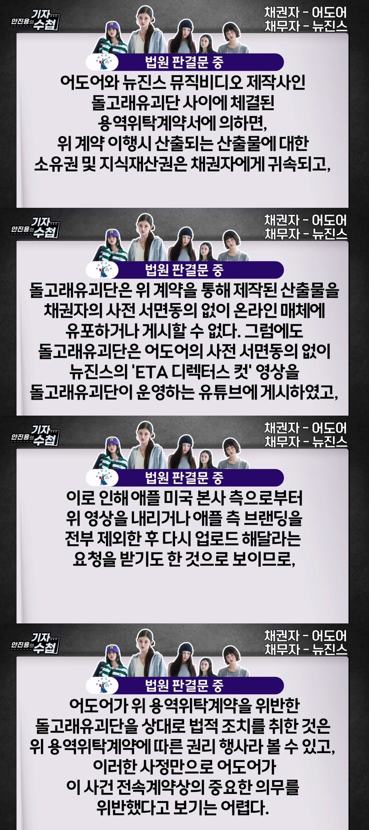 애플 허가를 받고 올렸다(O) 사실확인서 제출 문제가 있어서 내리라고 했다(O) 재판부 판례 저작권 침해고 무단으로 올린거다(X) 돌고래 소송 사유,하이브 언플 | 25.03.28 23:16 | | |