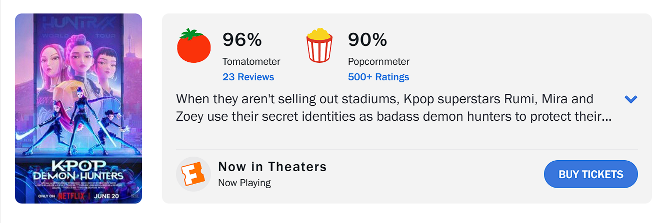 로튼 점수는 94% 에서 3% 올랐고 팝콘지수는 7%떨어져서 테러 받는거같음 높은 상태에선 좀처럼 떨어지거나 하는 점수가 아니라 | 25.06.24 14:04 | | |