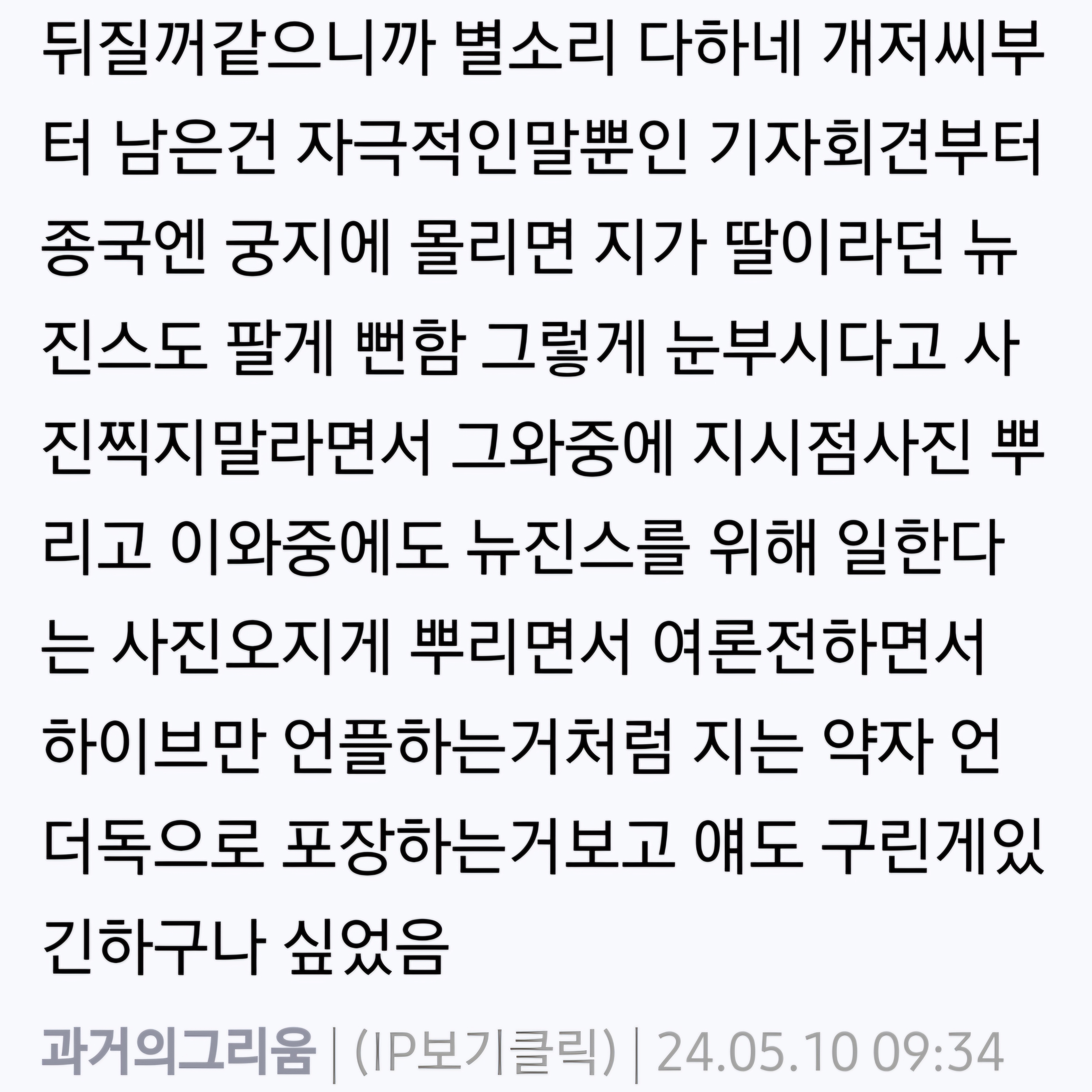 결국 2년전 느낌그대로 아직도 뉴진스 팔고 여전히 약자 피해자인척하며 감성 언플만하는 민희진 대체 증거로하는 맞다이는 언제 할런지? | 26.01.28 16:17 | | |