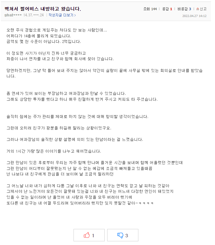 펄어비스가 거품낀걸 몰랐고 거품 빠지니까 회사에 물어볼 정도면 솔까말 이런 사람들은 주식에 손대면 안된다고 생각합니다. 그리고 솔까말 회사에 물어봐야 어차피 원론적인 답변밖에 안오고 주가 방어에 아무 도움도 안될뿐더러 그런 원론적인 답변은 저런 주식 커뮤니티에 이미 널렸거든요. | 22.04.27 14:41 | | |