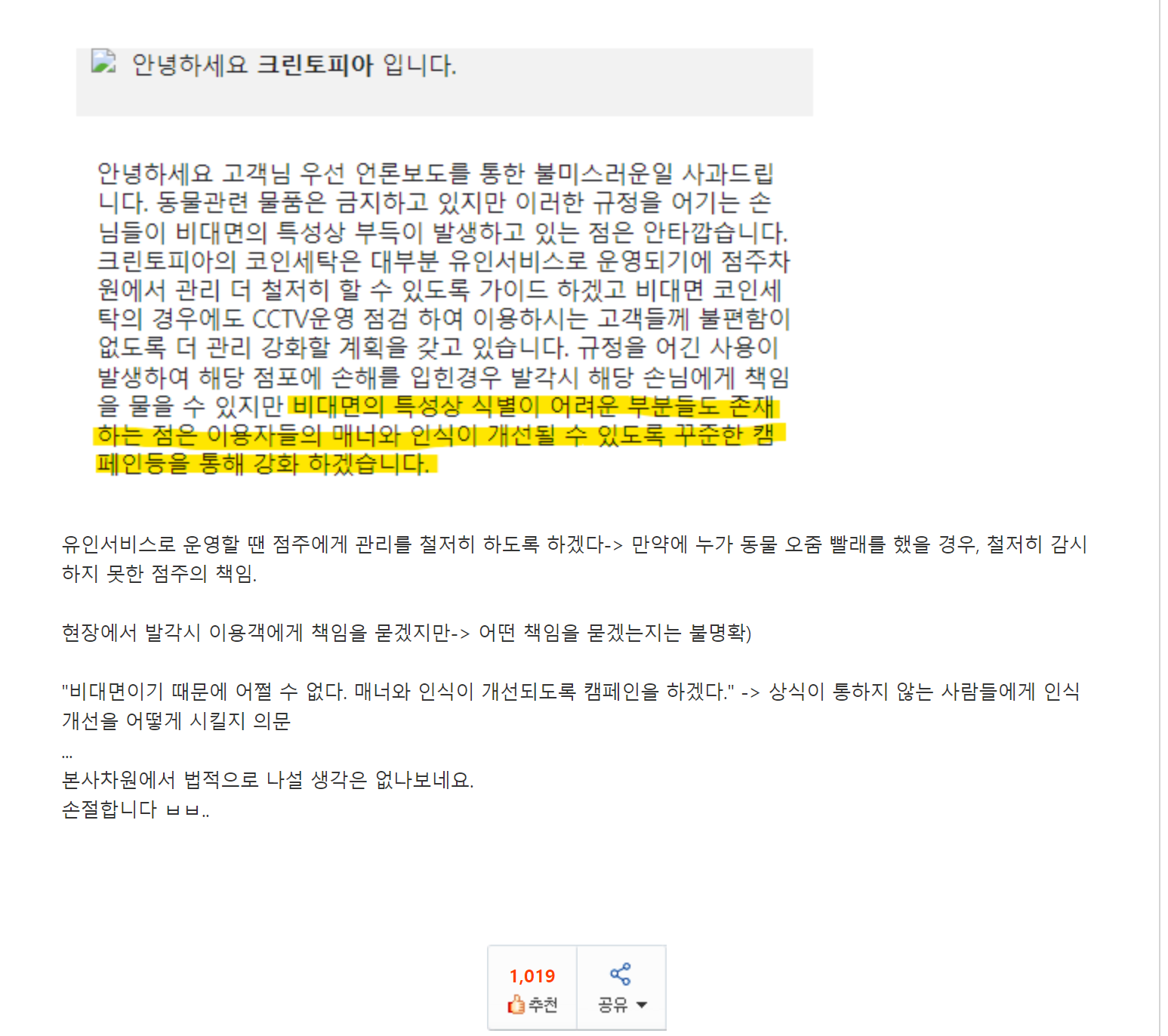 ????????? ㅋㅋㅋㅋㅋ 저게 말한대로 지켜지면 사람들이 걱정 안하지 캣맘들 상식 없는거 뻔히 아는데 저걸 안돌린다고? 거기다가 크린토피아 본사에서는 자기들은 대응 안하고 업주들이 알아서 해야 한다고 했음