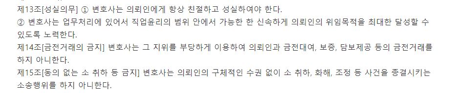 변호사 윤리장전에서도 위배되는 행위임...... 변호사가 행해야할 의무도 제대로 이행 안했다는거지.. | 23.04.06 00:19 | | |