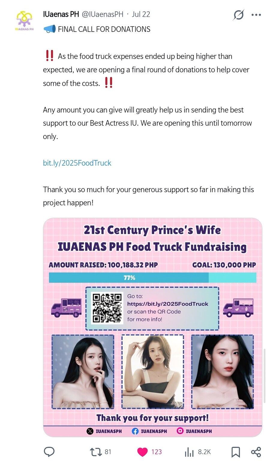 대군부인 촬영장에 푸드트럭 238만원 정도를 기부한 이후에도 이 정도로 기부액을 모으는 행동력이 대단하네요 | 25.08.18 13:49 | |