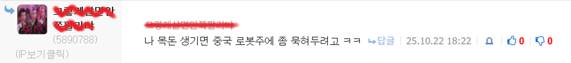 중국을 혐오하지만 중국 로봇회사 주식에 투자하는 이중성이란... 칭따오 맥주 먹고 때마다 중국 관광 가는 시점에서 답 없는 놈이였지만 중국 발전에 기여하면서 중국을 혐오하는 이율배반적 행동은 진작에 개그의 수준을 아득히 넘어섰죠. | 25.10.24 15:40 | |