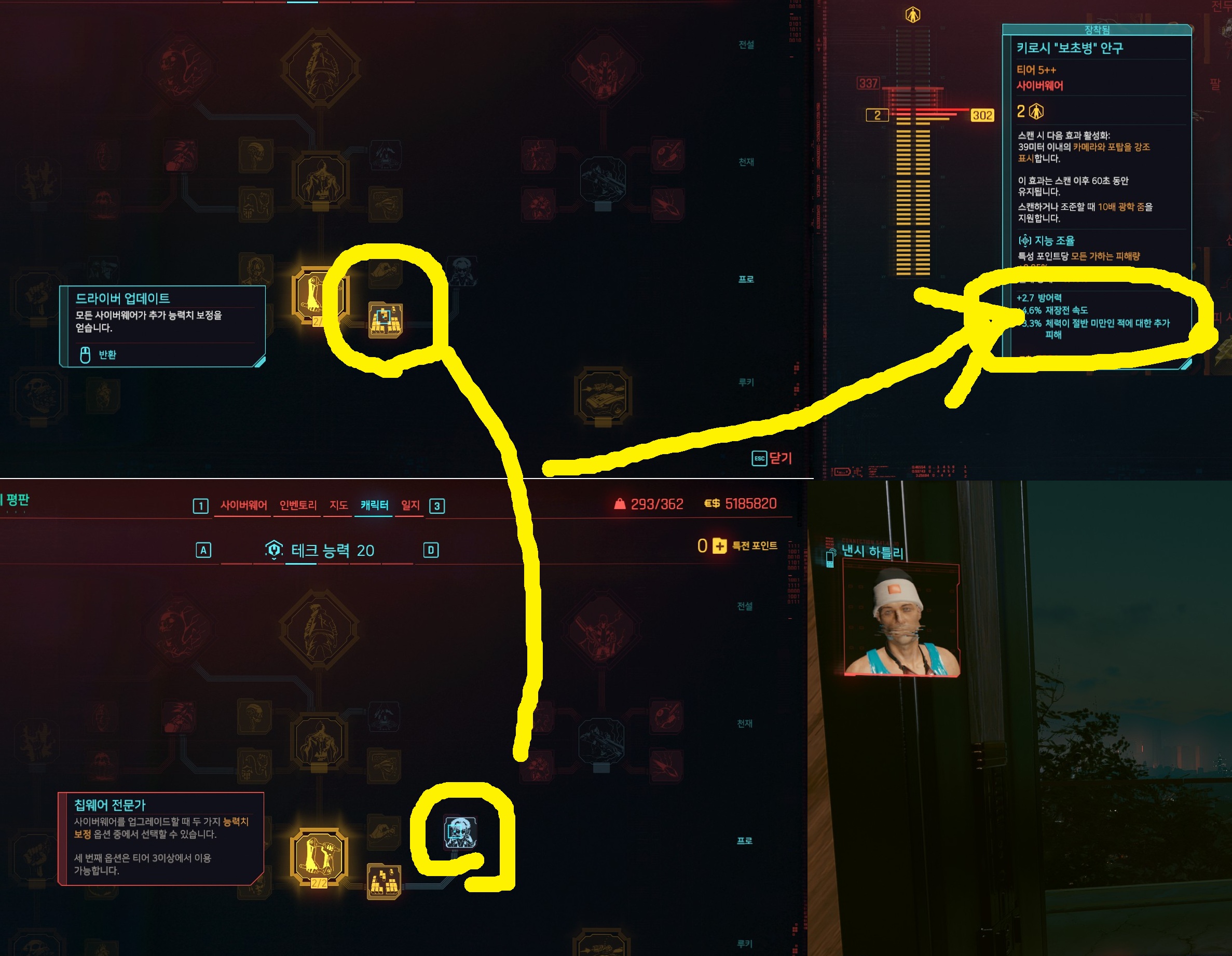 그리고 무기나 옷은 돈이나 부품이 부족한 경우 상점에 팔거나 분해하시면 됩니다 돈이 필요하면 = 상점에 팔기 부품이 필요하면 = 분해 (다중 분해가 없으니 좀 귀찮긴 합니다.) 첨부한 이미지는 사이버웨어에 능력치 달리는건데, 왼쪽 위는, 추가 능력치 부여해주는 스킬이고 오른쪽 아래는 추가 능력치 고를 선택지를 늘려주는 기능이예요. 오른쪽 아래 (칩웨어 전문가)는 사이버웨어 업그레이드 완료하면 스킬 빼셔도 됩니다 | 25.12.16 20:29 | |