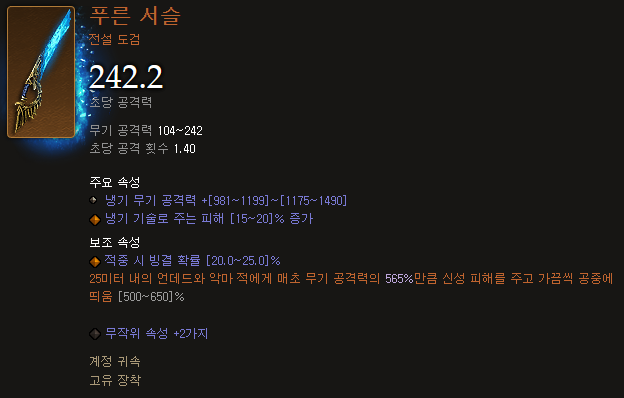 - 푸른 서슬(고유 도검): 행운의 적중 - 핵심 기술이 최대 20% 확률로 적들을 3초 동안 빙결시키고 0.75~1.5의 냉기 피해를 줍니다.