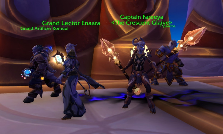 그레이슨 섀도브레이커 스톰윈드 빛의 대성당에서 만날 수 있는 상급 성기사 NPC로, 오리지날 때부터 성기사 유저들에게 기술을 가르치던 NPC입니다. 타레나, 기드윈, 피오나 (대격변 시점) 동부 역병지대에서 만날 수 있는 NPC들입니다. 이 시점의 타레나와 기드윈은 은빛 성기사단에 가입하고자 하는 풋내기 기사들입니다. 메라 돈블레이드 빛의 수호자 우서의 제자 중 한명입니다. 한때는 쿠엘탈라스 몰락 이유 중 하나가 우서 때문이라는 생각에, 우서를 증오했었습니다. 구원자 보로스 불타는 성전에서 첫등장. "아르거스의 대리인"이라는, 드레나이의 정예군단의 삼대장 중 한명입니다. 델라스 문팽 첫등장은 워3 달의여사제 중 한명입니다. 와우에서는 드군에서 첫등장. 이후 군단 시점에서 최초의 나엘 성기사가 됩니다.