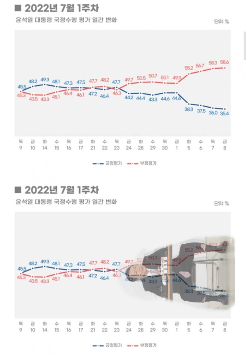 작성자님아...요즘에 저 지지율 그래프 많이 올라오는데 제발 부탁인데 그래프는 놔두고 오른쪽 윤도리 상판때기는 모자이크 처리 해줘..보기 힘들다..