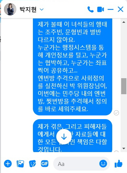지금은 참고 있지만 출당 당하면 자기 개인정보 캐고 협박질한 찢번방의 '매드노브들'에게 보복을 할거라고. 고발 막 하겠지. 박지현이 매드노브에 대해 "찢번방의 조주빈"이라는 말을 해버린다면 매드노브 앞으로 인생이 참담해지지 않겠냐? 적당히들 해라. 개딸들아. 이것들은 선이라는 게 없어.