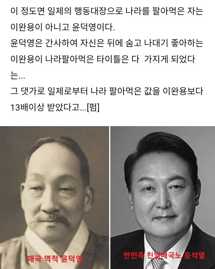 윤석열 해석본 친일파 - 왕국의 고위직을 하며 백성들의 고혈을 짜먹다 나라를 팔았다 그런데 나라가 독립해버렸다 (칙쇼!!!) 일본제국때는 국민들의 살생부를 쥐고 쥐락펴락했건만 이제는 매국노라는 낙인이 찍혀서 고개도 들지 못하고 눈치보며 설설 기어다닌다 미국에서 굴러먹던 이승만과 일제에 빌붙은 밑바닥 천민 박정희 패밀리 따가리짓이나 해먹고 살고 있어 개같다 (칙쇼!!!x2) 그렇게 역사의 지배자에서 따가리로 추락한지 반백년.. 천한 박정희 소생 박근혜 모가지 따고 지긋지긋한 근본없는 천민 따가리짓도 결별했다 일본에 사과 받아오라고? 내가 팔아먹는데 이제와서 사과 하라고 하면 내가 그동안 받은거 다 토해내야 되는데 죄를 인정하면 정치적 사회적 지위 다 포기하고 책임을 지라는건데 어느 미 친 놈이 자기 허물을 인정하려고 하겠냐?