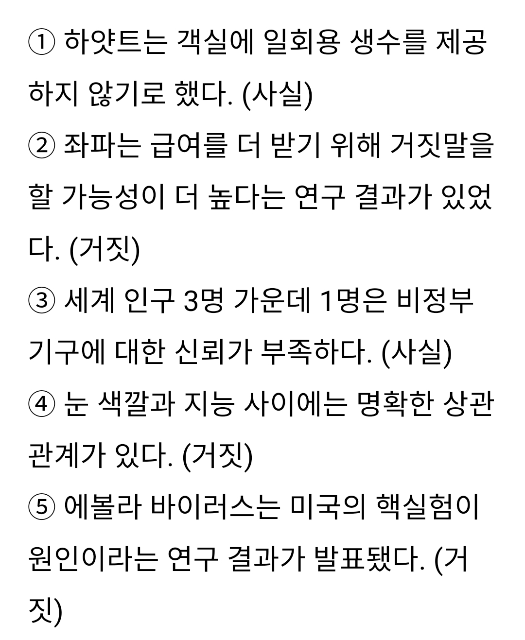 ① 하얏트는 객실에 일회용 생수를 제공하지 않기로 했다. (사실) ② 좌파는 급여를 더 받기 위해 거짓말을 할 가능성이 더 높다는 연구 결과가 있었다. (거짓) ③ 세계 인구 3명 가운데 1명은 비정부기구에 대한 신뢰가 부족하다. (사실) ④ 눈 색깔과 지능 사이에는 명확한 상관관계가 있다. (거짓) ⑤ 에볼라 바이러스는 미국의 핵실험이 원인이라는 연구 결과가 발표됐다. (거짓) ...라고 합니다. 사실이 둘 포함되어있었군요. | 23.07.27 11:21 | | |