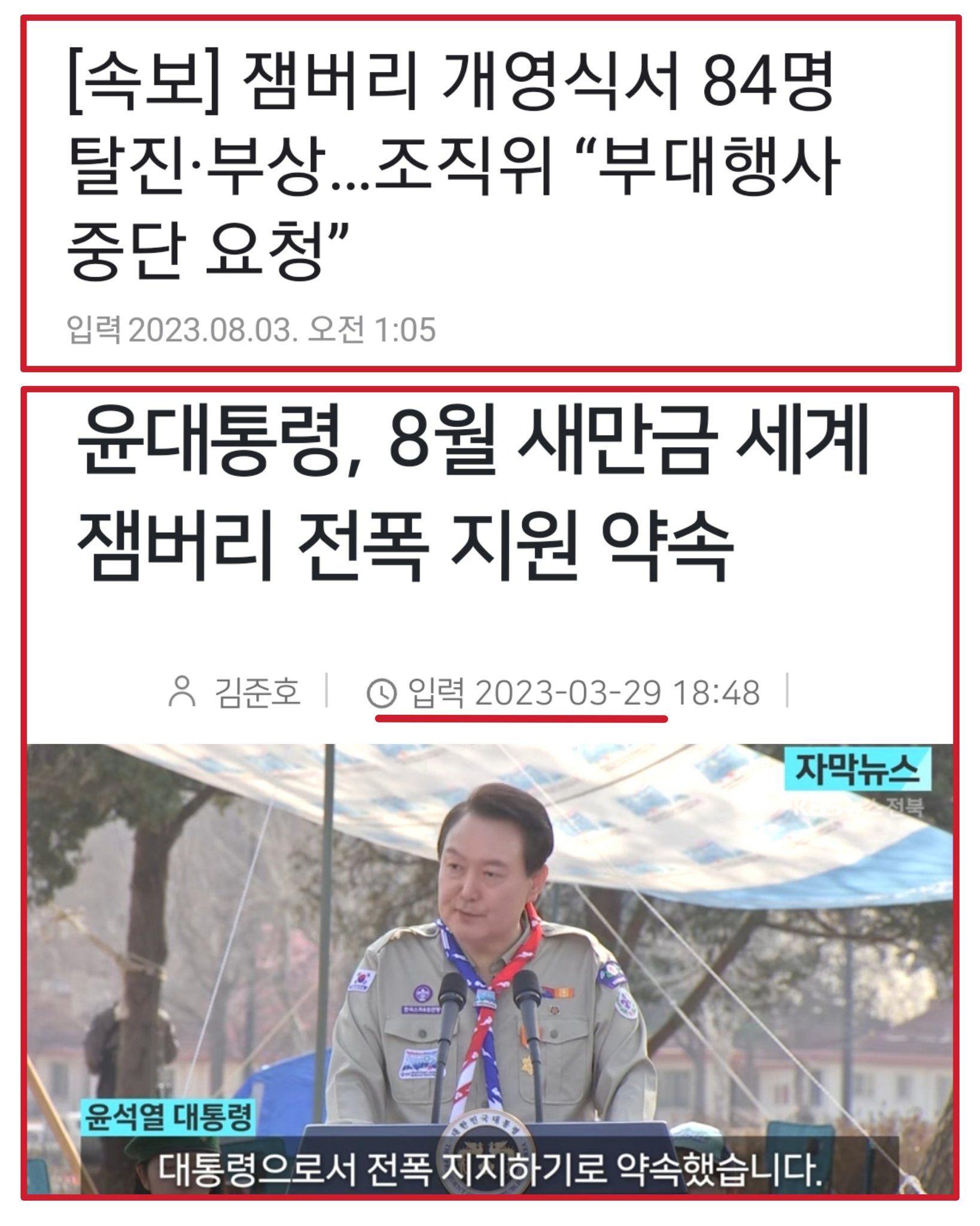 억울하긴 뭘 억울해 행안부장관이 몇일 전에 현장점검하고 1년전에 지금 문제되는 사유들 다 지적까지 하고 준비됐다고 한게 정부인데… 4개월전에 스카우트정복입고 잼버리 총지원하겠다는 윤니크 영상도 남아있는데 억울하다니까 국민이 울화통 터진다…