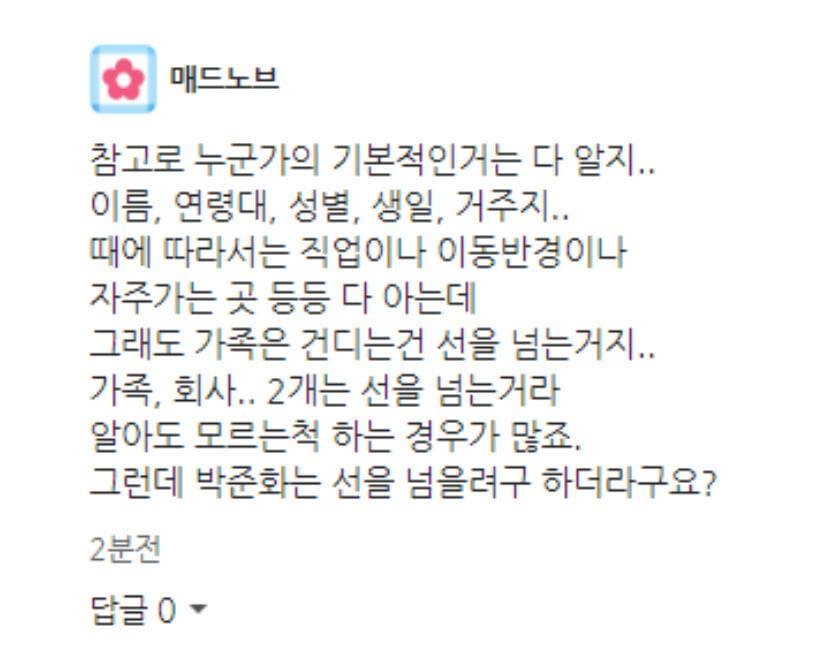 조주빈에게 피해자들 개인정보를 빼내준 거제시청 천 씨라는 씹새가 있었듯, 매드노브가 이재명 반대자들에게 가족 어쩌고 하며 협박할 수 있게 정보 제공한 놈들이 있겠지? 난 그놈들을 잡겠다는 거야. 나에게 반대하고 조롱하는 사정게 찢찍들은 그 행위만으로 정치계의 박사방, 찢번방이 될 것이다. 저게 그냥 협박일 뿐이며 개인정보를 캔 적은 없습니다, 하며 매드노브가 장애가 있읍니다 하며 읍소해 형량을 줄여보려 하겠지만 "아닙니다, 모든 정보는 실제 사용되었습니다" 하고 내가 증인으로 나서 뭉개준단 말이지. 전관 써라, 전관. | 23.09.03 15:30 | | |