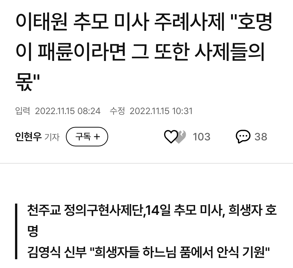 5.18을 목숨걸고 알린 정의구현사제단을 민폐라고 까는구나. 이게 자칭 이낙연 지지자라는 인간들의 본색이구나 | 23.10.16 20:39 | | |