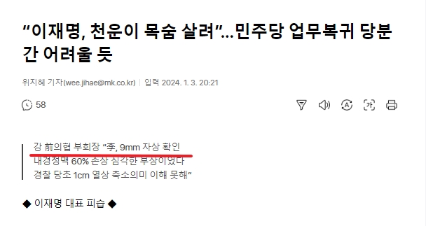 초 경찰 보도 1.5센치 열상 > 헬기로 후송한 소방대원 1센치 열상 > 민주당 대변인 1.4센치 자상 > 니가 말한 그 의사 9밀리 자상 | 24.01.03 23:57 | | |