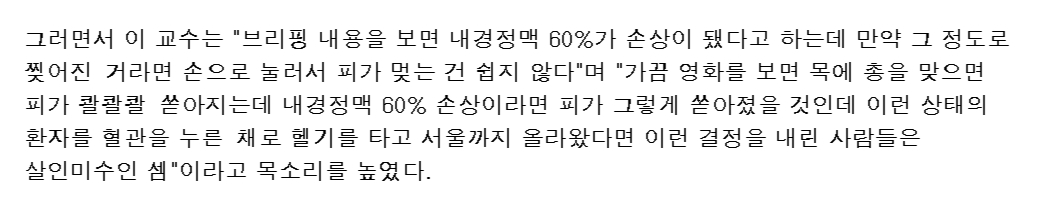 목에서 피가 뿜어져나오는데 그거 지혈하면서 헬기타고 서울로 올라왔다구요? 민주당 사람 말 보다는 이게 더 신빙성이 있어보이는데 | 24.01.03 23:45 | | |
