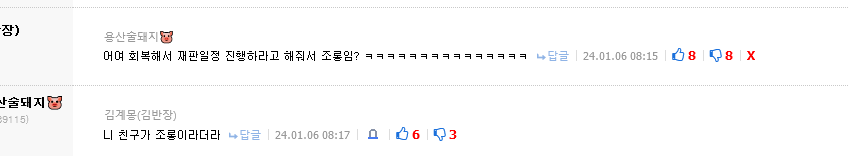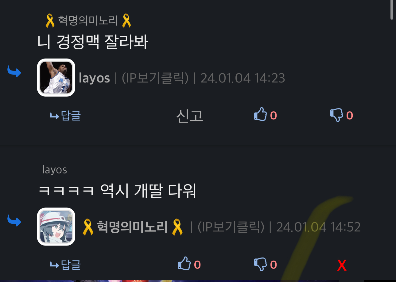 남의 마누라 사정 관심 없는데? 죄지었으면 벌받아라. 후비적. | 24.01.06 11:40 | | |