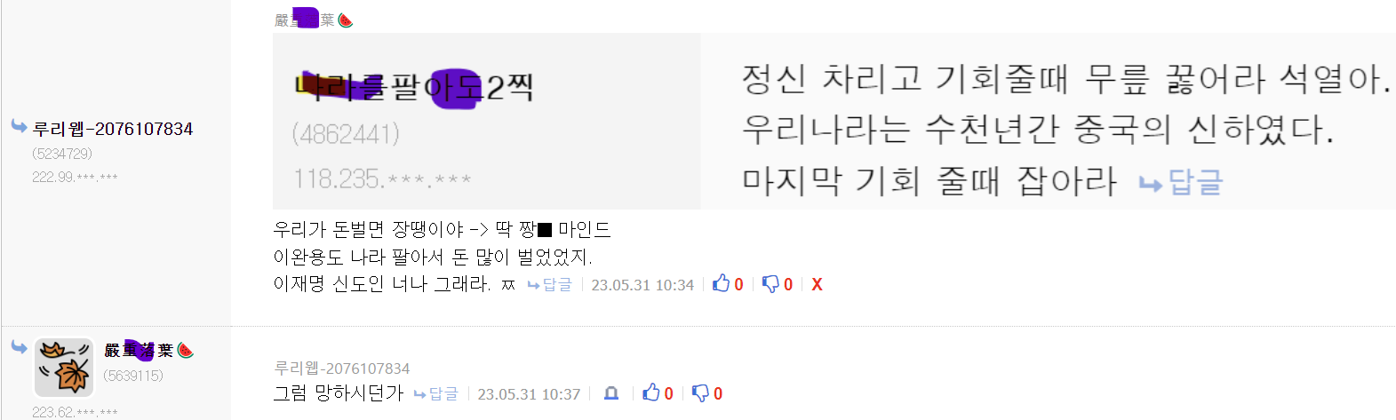 ㅋㅋㅋ 중국 스파이, 미국거주자 다 쫄아서 이수진에게 험한 댓글은 못다네. 남자가 그러면 쓰냐. 그렇게 뱃심도 없어? ㅋㅋㅋㅋㅋㅋㅋㅋ | 24.02.25 10:51 | | |