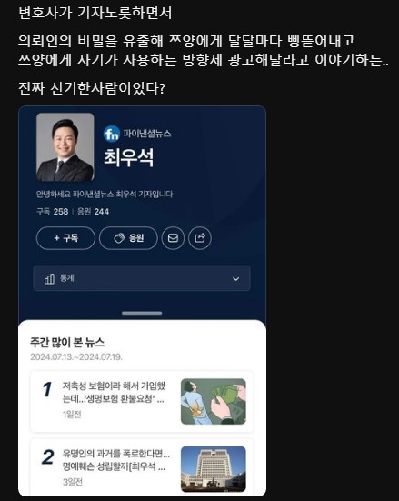 저런 최우석같은놈!!! 기사 작성한 꼬라지좀 보소. 유명인의 과거를 폭로한다면 명예훼손 성립할까? 저딴 기사를 써놨네. 아우 저 우라질 최우석 같은놈 | 24.07.20 00:39 | | |