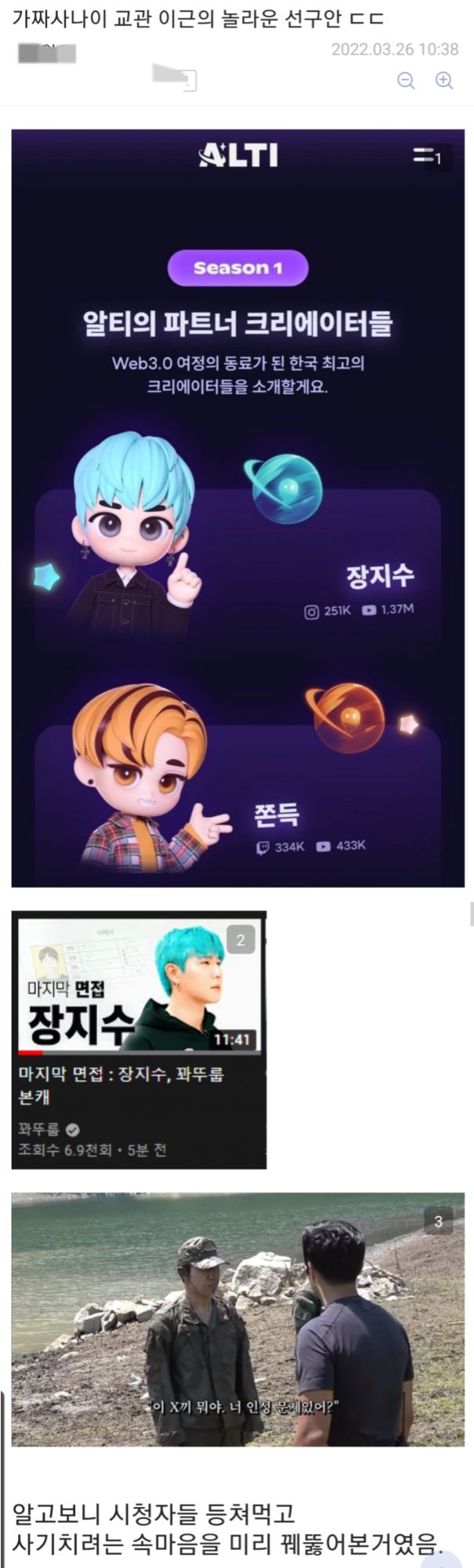 내가 보기엔 인플루언서들이고 주로 생방송으로 실시간 소통으로 장사하기도 실시간으로 쉽게 할 수 있으니 사시칠려는 사람들한테는 적격인게 방송인들임 그런데 코인게이트도 그렇고 지금도 그렇고 들고 일어난 시청자들이 그나마 이게 사기로 이어질 수 있는지 아닌지는 다들 잘 판단해서 실행이 안되었던거지 | 22.03.26 11:38 | | |
