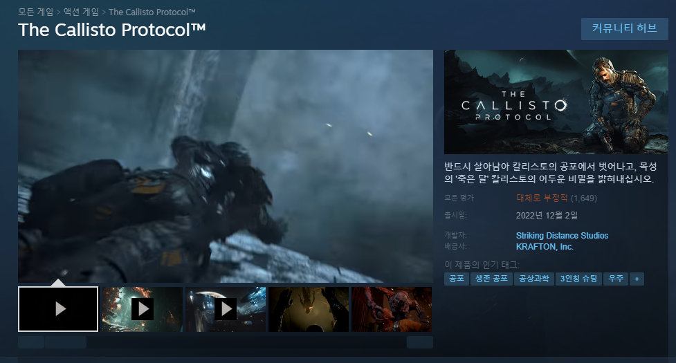 찾아보니까 부정적 평가는 죄다 최적화 이야기만 하고 있더라.. https://store.steampowered.com/app/1544020/The_Callisto_Protocol/