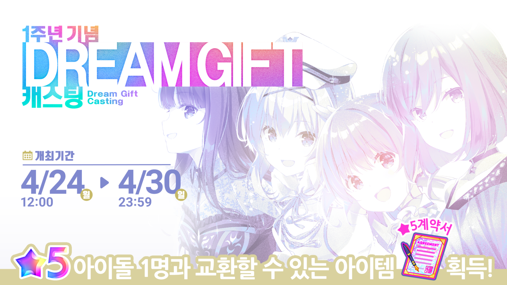 ★5아이돌로 교환 가능한 '★5계약서'가 포함된 1회 한정 10회 캐스팅 '1주년 기념 드림 기프트 캐스팅'이 개최 중!