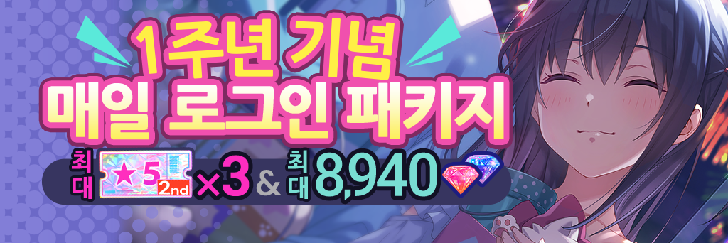 매일 로그인하면 최대 ★5확정 캐스팅 티켓 2nd x3와 레드 다이아・블루 다이아 합계 8,940 다이아를 얻을 수 있는 '1주년 기념 매일 로그인 패키지'가 등장 !