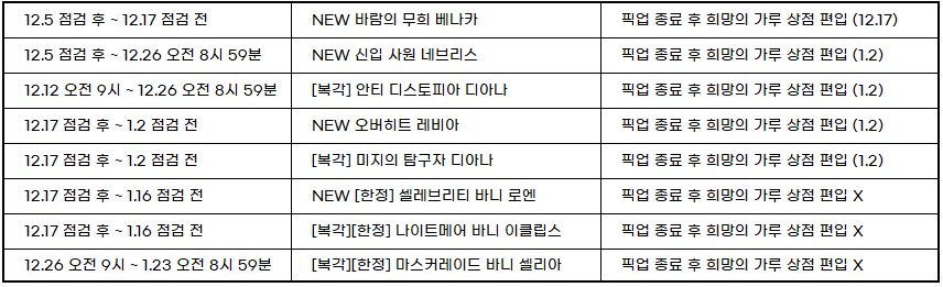 ㄴ 뽑기 풀은 12월 17일 점검 전까지의 코스튬으로 구성되어 있으며, 12월 17일 점검 후 진행되고 있는 픽업 및 한정 코스튬은 뽑기 풀에서 제외됩니다.