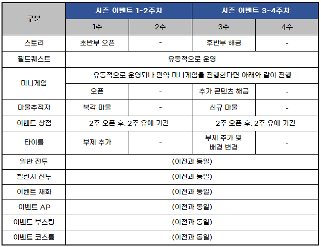 - 시즌 이벤트 진행 기간이 4주로 변경됨에 따라 스토리 해금 방식이 변경됩니다.