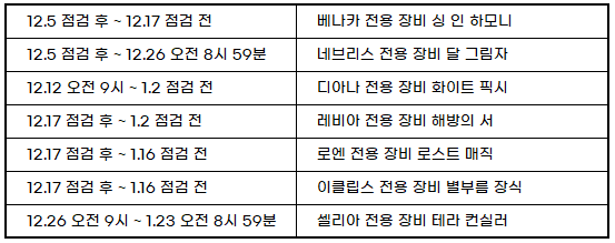 - 아래 일정에 따라 코스튬과 전용장비가 추가됩니다.