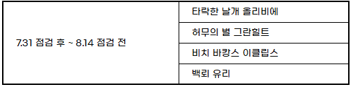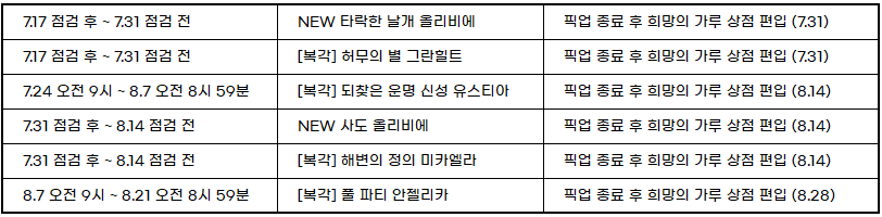 2) 해변의 정의 미카엘라 : 2025년 7월 31일(목) 점검 후 ~ 2025년 8월 14일(목) 점검 전까지 진행됩니다.