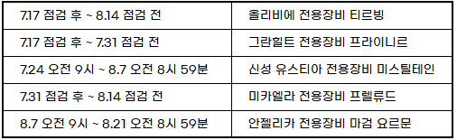 - 아래 일정에 따라 코스튬과 전용장비가 추가됩니다.
