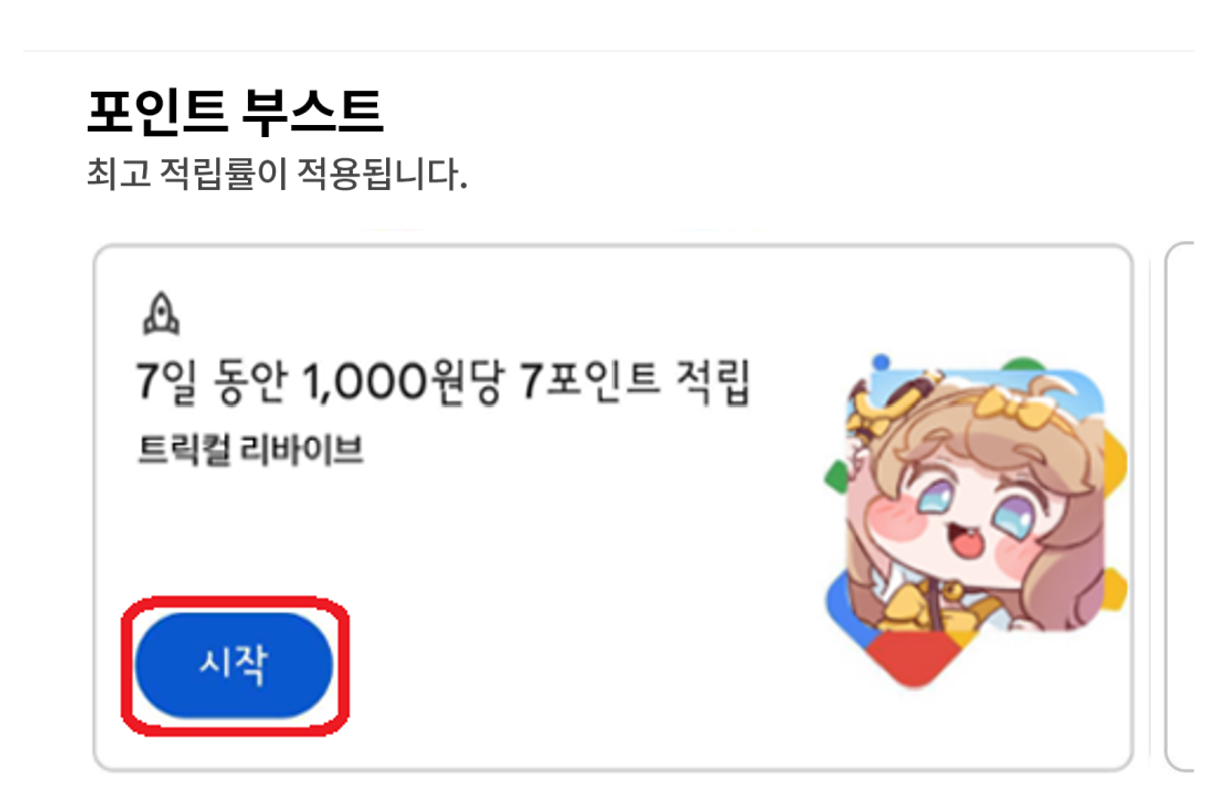 구글 플레이 스토어 계정 → 플레이 포인트 터치 → [적립] 카테고리에서 [트릭컬 리바이브] 부스트 시작