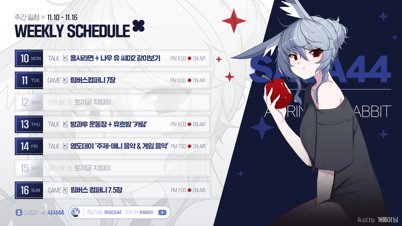 9226 일정 🗓️ 사사님 방송 일정 안내 (11.10~11.16) (1) _ 수히나 2 213 2025.11.10