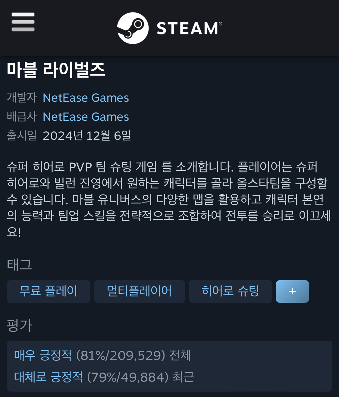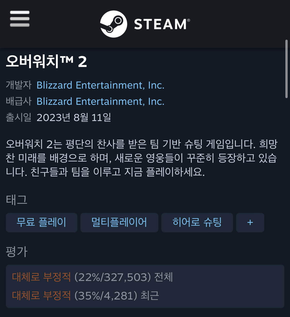 이건 게임 자체 평가가 아니라 블리자드 민심 반영 아니었나요? 스팀평가를 제외하면 게임자체는 동접자만 봐도 거의 10배 넘게 차이나고.. 일단 옵치는 세계 7위.. 게임 인데 분발은 마블 라이벌즈가 많이 해야 하지 않을까요? 지난 30일간의 1일 동접자 수를 비교해보면 라이벌즈 475,870 오버워치2 5,808,564 ???? | 25.02.13 18:53 | | |