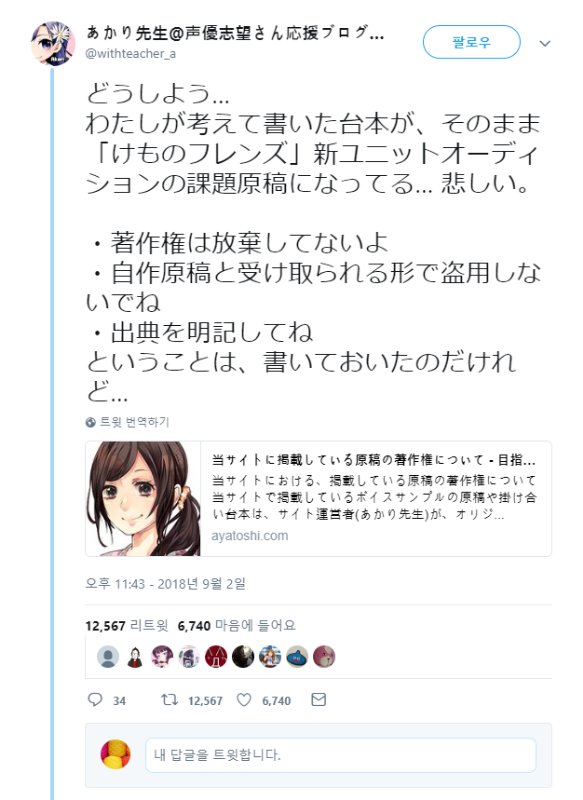 트윗번역) 어쩌지...내가 생각하고 쓴 대본이 그대로 "케모노 프렌즈 새 유닛 오디션 도전 원고"가 돼어 있다... 슬프다. "저작권은 포기하지 않았다.", "자작 원고와 받는 형태로 도용하지 도용하지 말 것.", "출처는 반드시 명기 해주세요."이렇게 적어 놓았건만... | 18.09.03 14:17 | | |