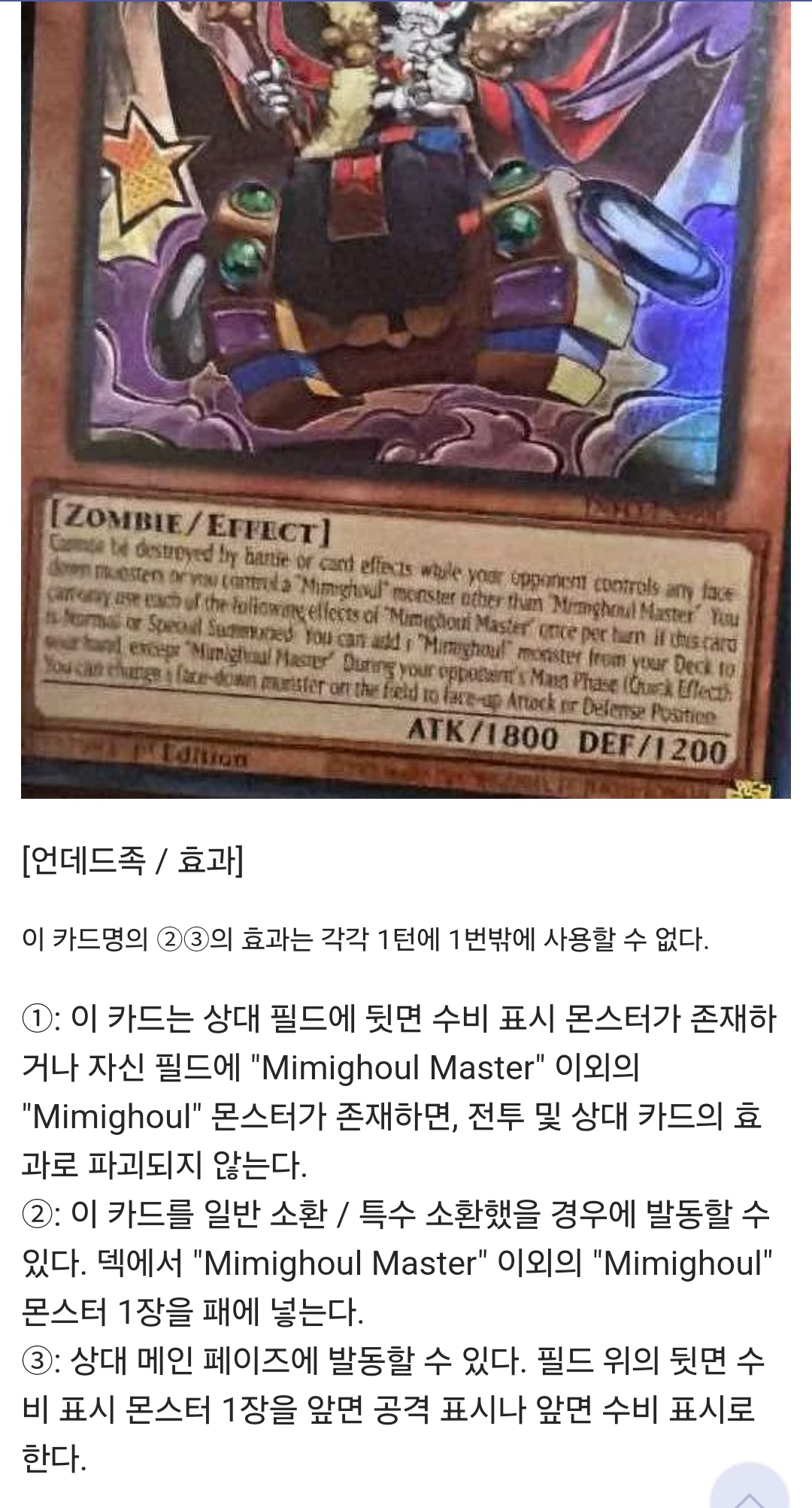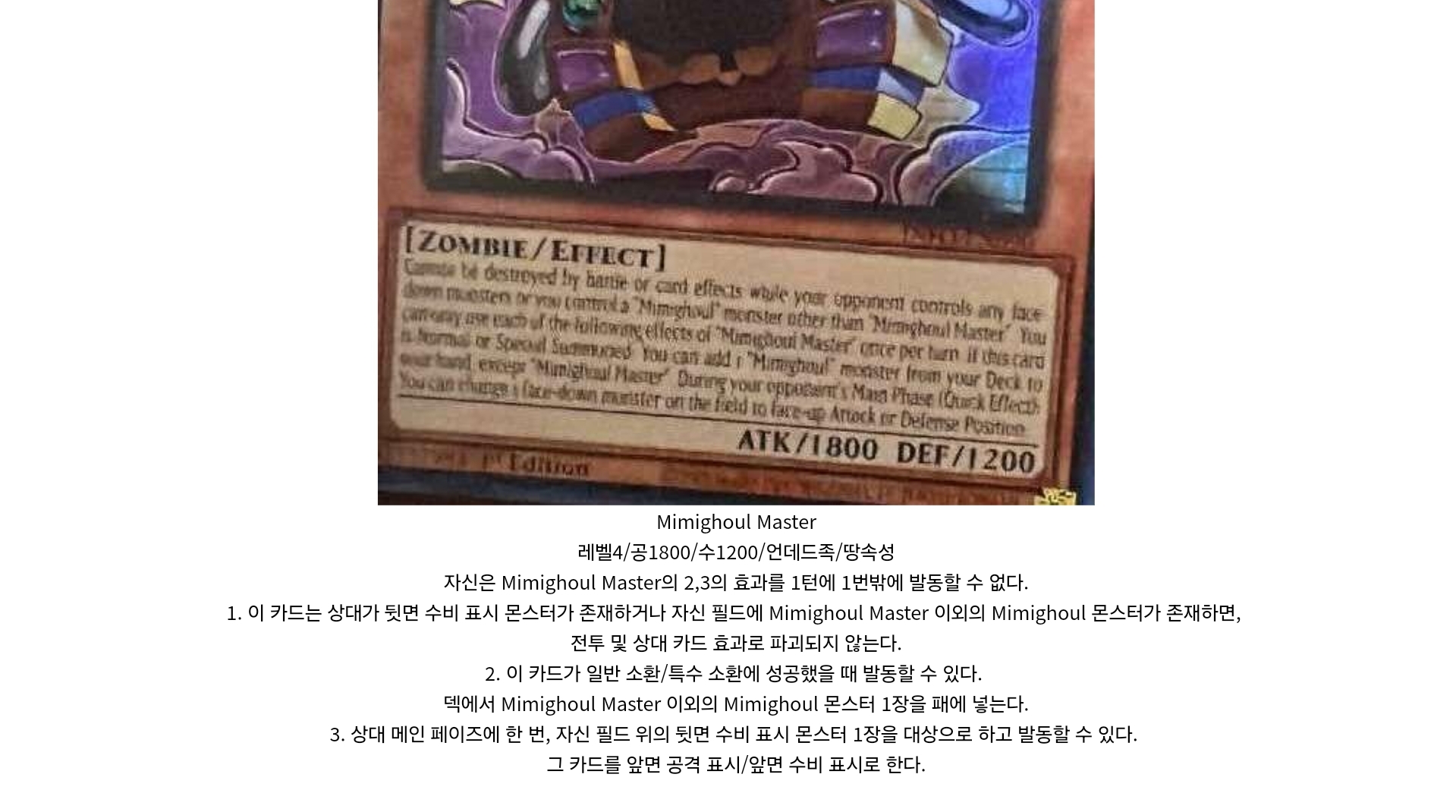 3 : 이 카드가 일반 소환/특수 소환에 성공했을 때 발동할 수 있다. 덱에서 “Mimighoul” 마법/함정 카드 1장을 패에 넣는다.