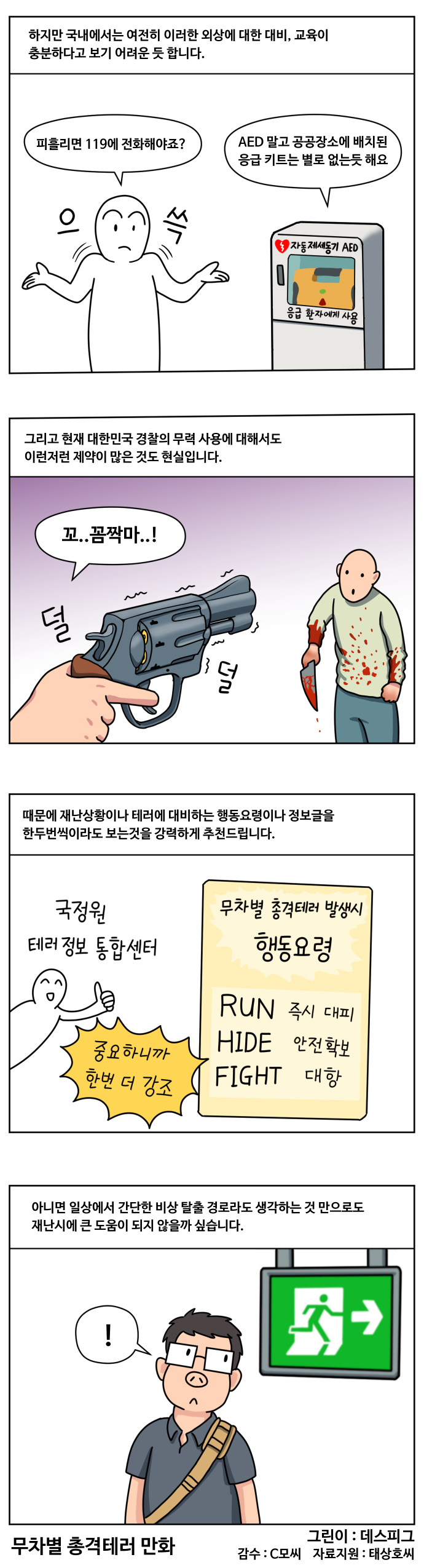나름 현실적인 문제를 짚어주셨네요. http://www.hani.co.kr/arti/society/region/858491.html 바로 작년에 총기 사건이 있었죠. 무차별 난사는 아니지만 우리나라에서도 충분히 일어날수 있는 일입니다. 무엇보다 산탄총은 반자동도 많고 벅탄 같은 대인 살상에 적절한 탄약도 구할수 있다고 들었는데 누군가 악착같이 준비하고 총기 연습을 한다면 언제든 일어날수 있는 일이죠. 여기에 대응하는 한국 경찰의 능력은..... 대응할수 있는 경찰SWAT는 숫자도 적고 사건현장에서 멀리 있는 경우가 대부분이겠죠.