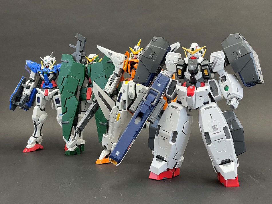 양 어깨의 GN 캐논은 포신이 신축, 기체 상단으로 이동시켜 공격 형태도 재현.
