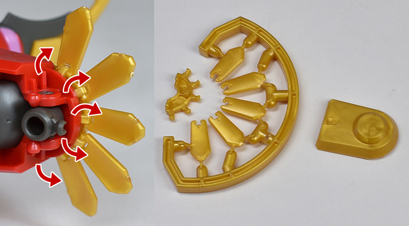 또한 이번에는 이마가와 야스히로 감독 고안의 프라모델 오리지널 기믹으로서 4장의 실드의 사출 상태도 재현 가능.