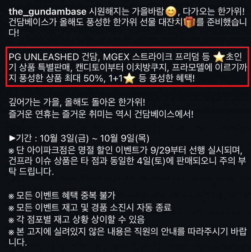 ※ 단 아이파크점은 명절 할인 이벤트가 9/29부터 선행 실시되며, 건프라 이슈 상품은 타 점과 동일한 4일(토)에 판매되오니 주의 부탁 드립니다.
