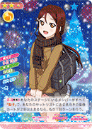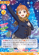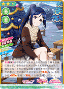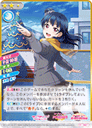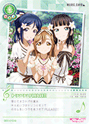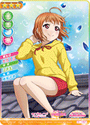 【등장 시】당신의 대기 중인 멤버가 전부 「요우」라면, 카드를 2장 뽑는다. 추가로 대기 중인 「요우」의 라이브 의상이 3종류 이상이라면, 이 멤버를 참가시켜서 《라이브》 할 수 있다. |